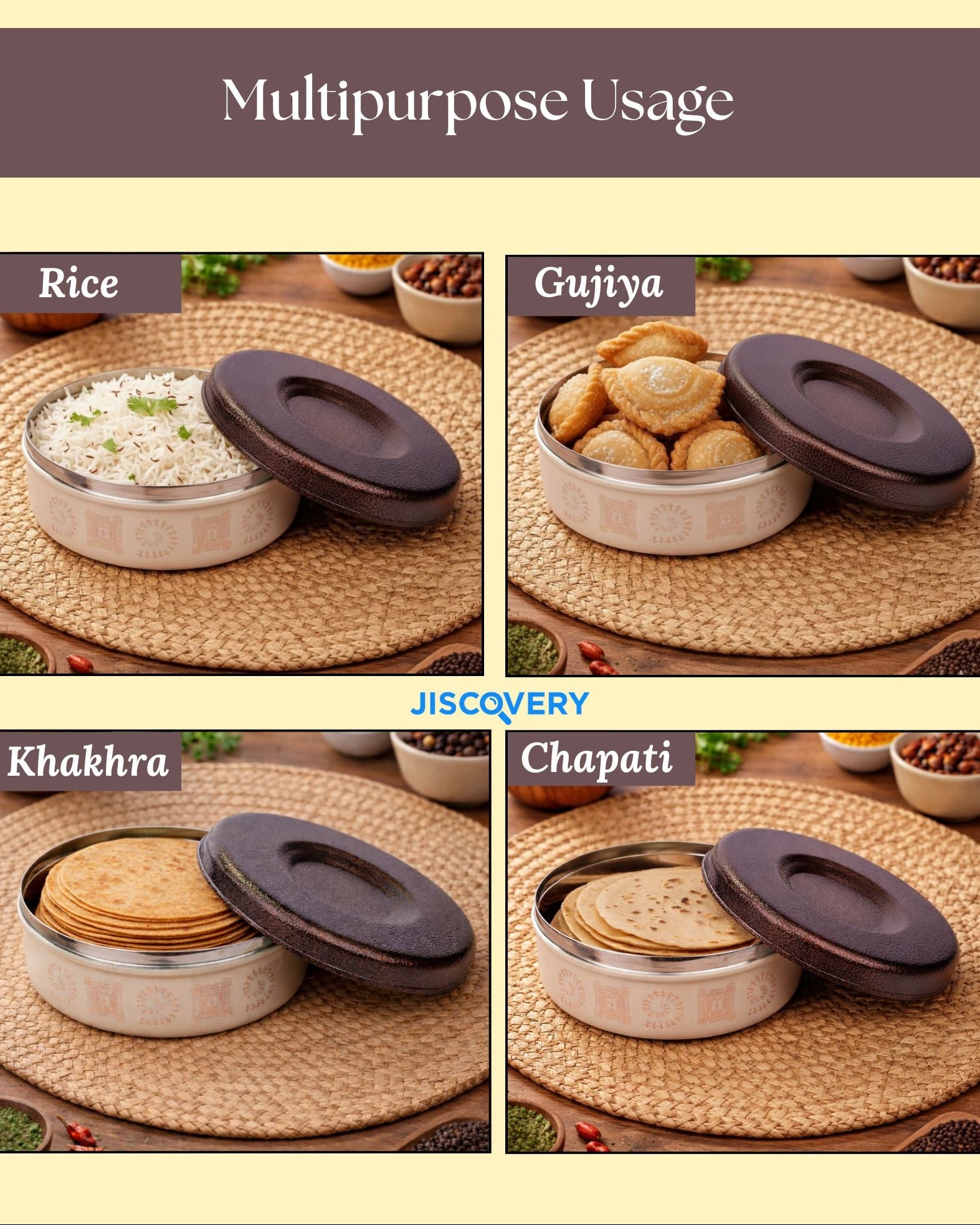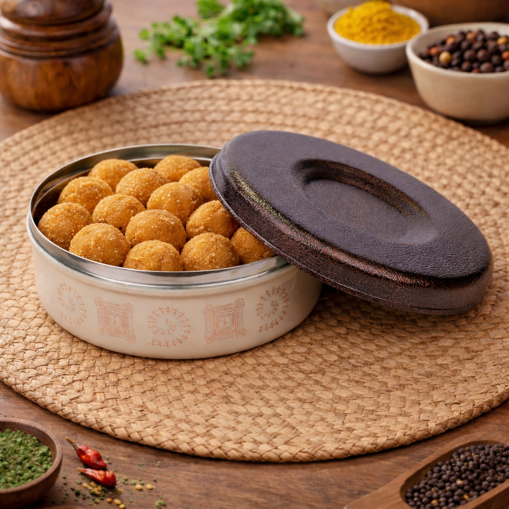 Keep your food fresh, warm, and organized with the Jiscovery Stainless Steel Airtight Designer Multipurpose Box. Crafted from premium-quality stainless steel, these containers are durable, rust-free, and long-lasting — perfect for everyday kitchen use. The airtight lid locks in freshness and prevents leakage, making them ideal for storing rotis, snacks, curries, dry fruits, coffee, sugar, and more. With a sleek and modern design, these dabbas not only add elegance to your kitchen but also ensure hygiene and safety for your food. Each container has a 1000 ml capacity, providing ample storage for daily needs. Easy to clean and maintain, they are also travel-friendly and great for office lunches or picnics. Whether you use them as roti dabbas, lunch boxes, or kitchen organizers, Jiscovery’s airtight multipurpose containers are the perfect blend of style, functionality, and convenience for every household.