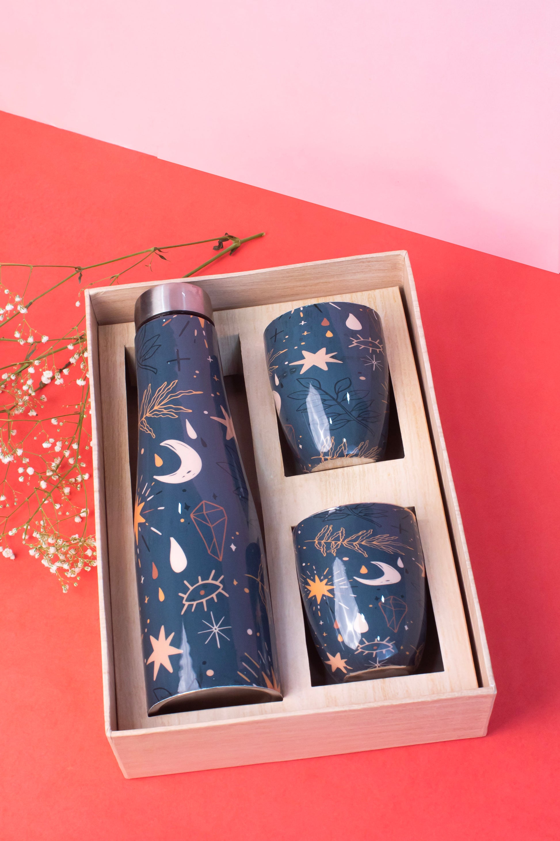 "Introducing the Jiscovery Printed Water Bottle Set, a fusion of functionality and aesthetic appeal. Crafted meticulously from premium stainless steel, this 1-litre bottle is a statement piece, perfect for elevating your hydration experience at the office, school, or home. Its sleek design, adorned with intricate prints, not only quenches your thirst but also adds a touch of elegance to your daily routine. This meticulously curated set includes two 300ml glasses, fostering moments of shared refreshment and connection. Whether you're navigating through intense meetings, engaging classrooms, or simply unwinding at home, this set ensures you stay hydrated in style, enhancing every sip with its exquisite design and durable construction. The Jiscovery Printed Water Bottle Set isn't just about functionality; it's a symbol of sophistication and self-expression. Embrace the blend of practicality and beauty as you make a statement with every sip. Elevate your hydration game and indulge in the luxury of staying refreshed with Jiscovery's 1-litre steel printed water bottle set today!"